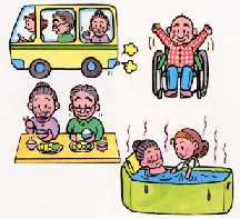 | サービスの内容 昼間、デイサービスセンターにバスで送迎して、入浴、給食、日常動作訓練などを行います。 |